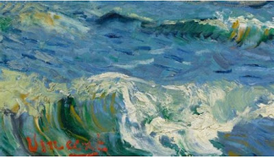 In one dominantly azure sea scape (pictured below), he chose to imprint his name in scarlet, providing a complete contrast to the rest of the piece.